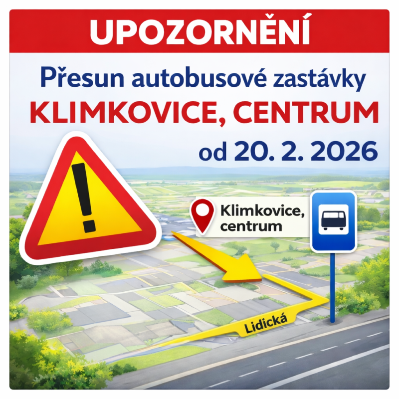Od 20. 2. 2026 je z důvodu uzavírky ul. Požárnické dočasně přesunuta zastávka Klimkovice, centrum na zastávku Klimkovice, výkupní závod (ul. Lidická).