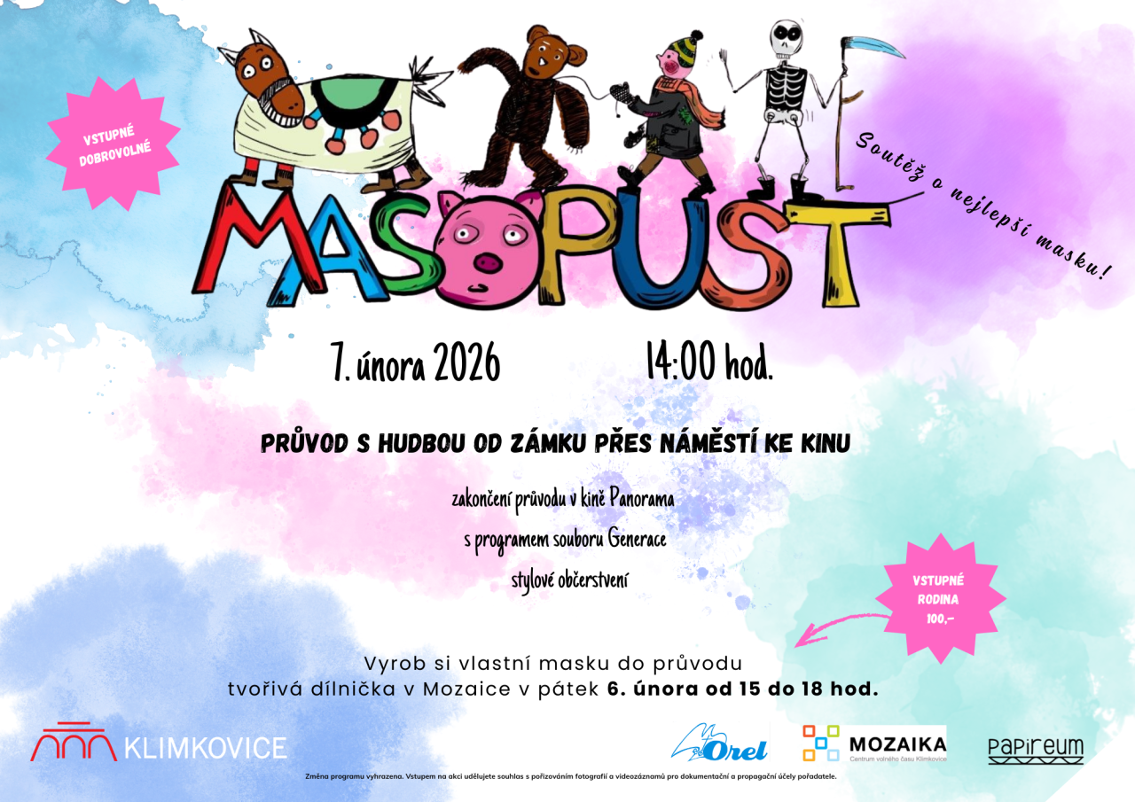 14:00 – sraz u zámku a start masopustního průvodu s hudbou